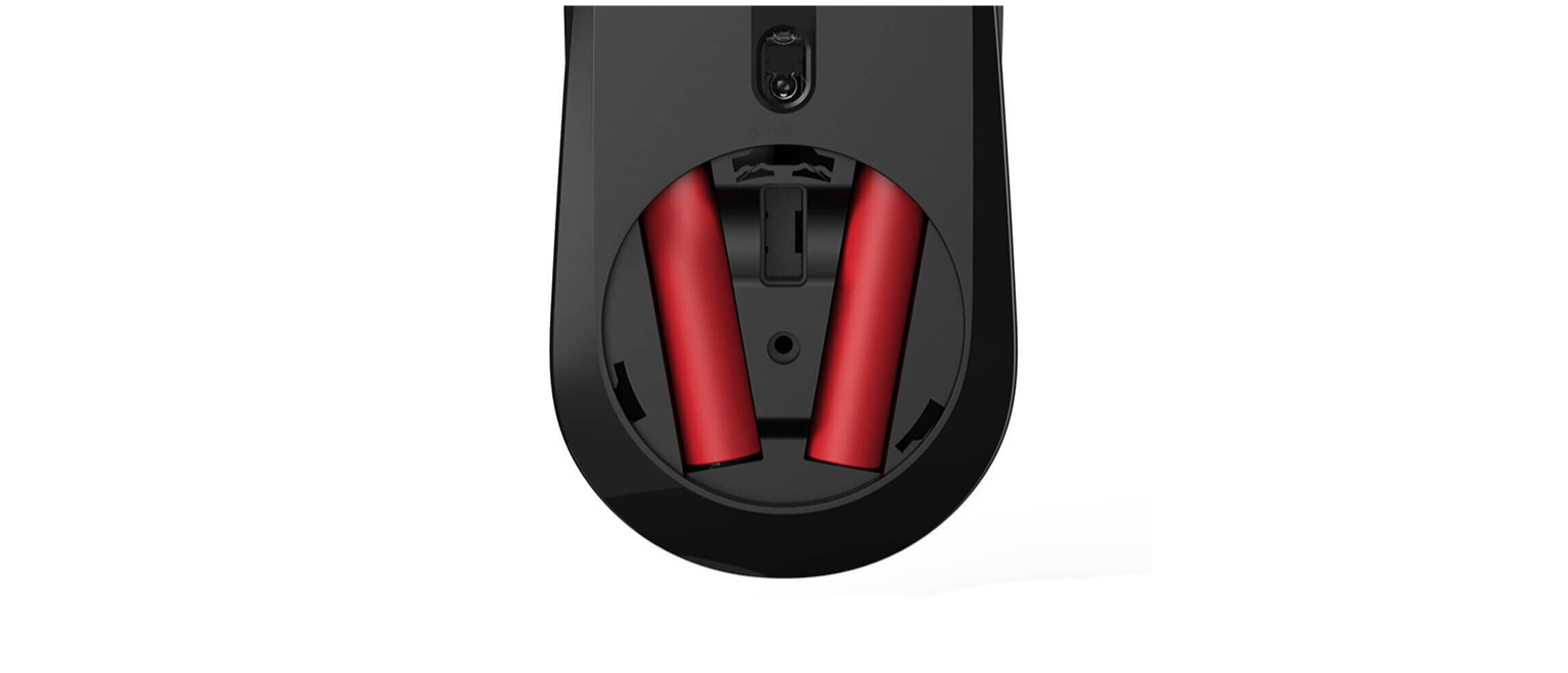 У передній частині корпусу розташована кнопка живлення. Як елементи живлення використовується дві батарейки типу ААА, які встановлюються в надійно захищений пластиковою кришкою батарейний відсік. Батарейки підтримують роботу мишки протягом року.
